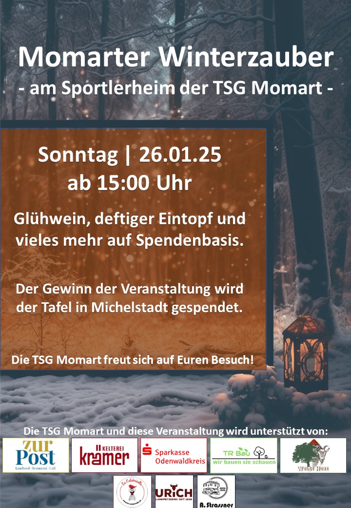 Die TSG Momart lädt herzlich zum Momarter Bembelgarten am 23. und 24.08.2025 am Sportlerheim in Momart ein! Bei toller Aussicht und guter Stimmung werden Odenwälder Spezialitäten wie Ebbelwoi im Bembel, selbstgemachter Kochkäs und Handkäs sowie Odenwälder Hefekuchen angeboten.